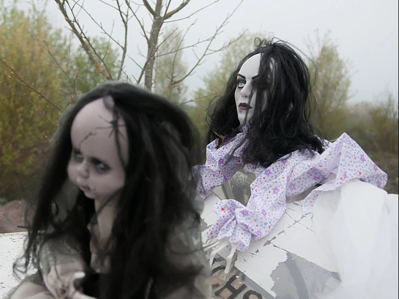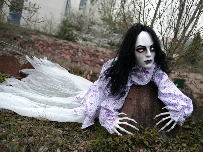 Het bleke gezicht van de jonge vrouw toont duidelijk de sporen van haar ontsnapping. Ze kruipt wanhopig over de vloer terwijl er een eng geluid klinkt. Het bovenlichaam van de vrouw, gekleed in een jurk met patroon, berooft naar voren door een ingebouwd mechanisme van ongeveer 50 cm per keer. Rood knipperende LED-ogen completeren de animatie, die wordt gestart door een geïntegreerde microfoon.