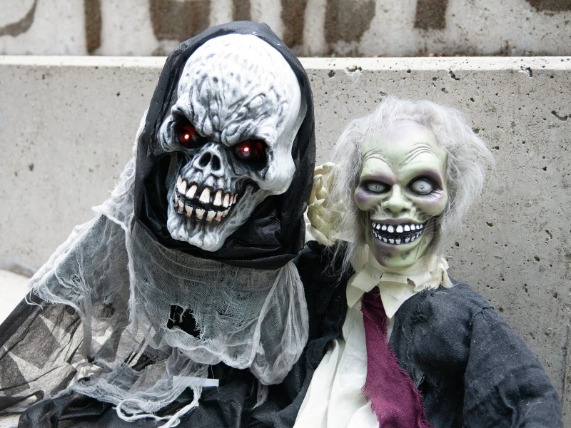 Bent u nog op zoek naar de juiste highlight voor uw thema of halloweenfeest? Alleen het grijze, extra grote gezicht van Magere Hein met zijn grove trekken mist zijn effect op de toeschouwer niet. In elk van de enorme oogkassen zit een rode knipperende LED. Terwijl een stem met spookhuisgeluid te horen is, kantelt het lichaam van de buste naar links en rechts via een excentrische aandrijving. De dode man is gekleed in een gescheurde mantel met een kap met grote benige handen aan de uiteinden. De animatie wordt geactiveerd door een geïntegreerde microfoon of een bedrade, handmatige bediening.
